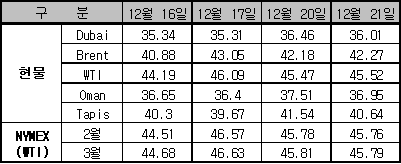 석유공사, Dubai유 36.46달러로 약보합 … WTI는 45.47달러 12월21일 국제유가는 미국 동북부 지역의 기온이 온화할 것으로 예상되는 가운데 미국의 석유 재고감소 예상, 이라크에서의 미군기지 피습 소식 등으로 보합세를 형성했다.한국석유공사에 따르면, 12월21일 NYMEX 시장의 WTI 선물유가는 전일대비 배럴당 0.02달러 하락한 45.76달러에, IPE 시장의 Brent 선물유가는 0.08달러 하락한 42.37달러에 거래가 종료됐다. 반면, Dubai 현물유가는 20일 하락요인이었던 미국 동북부 지역의 기온이 온화할 것이라는 예상으로 인해 0.45달러 하락한 36.01달러를 기록했다.