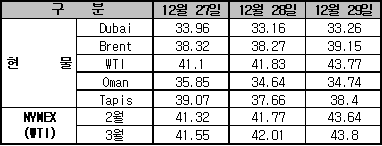 Dubai, 33.26달러로 0.10달러 상승 그쳐 … WTI는 43.77달러로 급등 사우디아라비아 폭탄테러와 미국의 원유 재고 감소 발표의 영향으로 국제유가가 상승했다.한국석유공사에 따르면, 12월29일 현지에서 거래된 미국 서부텍사스 중질유(WTI)는 28일보다 배럴당 1.94달러 오른 43.77달러를, 북해산 Brent유는 0.88달러 상승한 39.15달러를 기록했다. 중동산 Dubai유도 33.26달러로 0.10달러 올랐으며, 뉴욕상업거래소(NYMEX)의 WTI 2월물 선물가격은 1.87달러 상승한 43.64달러에 거래됐다. 그러나 런던 국제석유거래소(IPE)의 Brent유 선물가는 2일간의 휴장으로 28일의 유가 하락요인이 뒤늦게 반영되면서 0.90달러 하락한 39.17달러로 장을 마쳤다. 석유공사는 “세계 최대의 석유 수출국인 사우디의 수도 리야드에서 연쇄 차량폭탄테러가 발생하고, 미국 에너지정보청이 발표한 원유 재고가 당초 예상과 달리 감소한 것으로 나타나면서 국제유가가 상승세로 반전했다”고 분석했다.