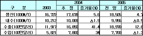수출도 세계적인 공급부족 및 해외수요 확대의 지속과 생산능력 증가에 따른 수출여력 확대 등으로 전년대비 12.6% 증가하나 2004년의 40%대에는 크게 미치지 못할 것으로 예상되고 있다.