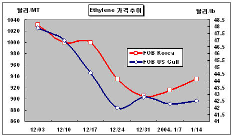 그러나 Solvay 관계자는 “현재 공급선을 다각화해 Shell의 영향을 최소화하도록 노력하고 있으며, 5월까지는 재고와 다른 공급선에서 들어오는 물량으로 플랜트 가동을 정상적으로 가져갈 수 있을 것”이라는 입장을 표명했다. <심주영 기자> 표, 그래프: | Ethylene 가격추이 | <화학저널 2005/01/19> |