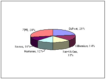 TiO2 생산기업들은 수요강세 및 가동률 상승에 힘입어 10월 계약가격을 파운드당 96-98센트로 6센트 인상하는데 성공했다. 2004년 북미 TiO2 가격은 파운드당 90센트로 전년대비 6% 상승했으며 2005년에는 약 99센트에 달할 것으로 예상되고 있다. 한편, DuPont은 앞으로 TiO2 수요가 연평균 약 3% 증가하는데 그칠 것으로 보이나 가격은 당분간 월 평균 약 10-15달러 상승할 것으로 전망하고 있다. 표, 그래프: | 세계 Titanium Dioxide 생산능력 비중 | <화학저널 2005/01/20> |