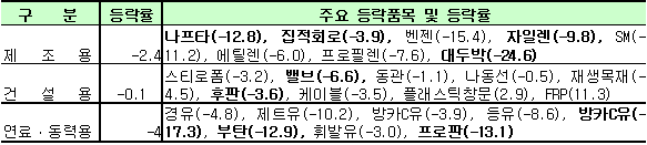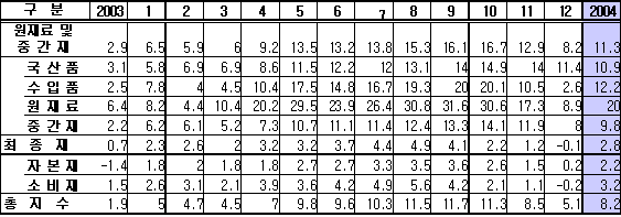 그러나 최근 몇달동안 환율하락과 함께 국제유가가 하향 안정세를 보인데 힘입어 2004년 12월 원재료ㆍ중간재 물가는 전년동월대비 8.2% 상승에 그쳐 7개월째 이어오던 2자릿수 상승률 행진을 마감했다. 또 전월대비로는 2.7% 하락해 2달째 내림세를 이어갔다.