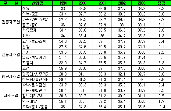 상의, 화학 35.2세에 플래스틱 37.7세 … 철강ㆍ조선ㆍ자동차도 문제 저출산 현상이 확산되고 있는 가운데 주력산업인 철강, 조선, 자동차 뿐만 아니라 첨단제조업, 서비스업에 이르기까지 산업인력 고령화가 지속되고 있어 성장잠재력 확보에 비상이 걸렸다.대한상공회의소(회장 박용성)는 <최근 인구구조 변화가 산업에 미치는 영향> 보고서를 통해 저출산, 고령화 등 인구구조 변화가 산업경쟁력 향상의 큰 걸림돌로 작용할 우려가 있다고 주장했다. 보고서에 따르면, 전통제조업 중 의복ㆍ모피산업과 섬유산업이 1994년에 비해 2003년에는 평균연령이 각각 5.8세, 5.2세 높아져 고령화가 가장 빠르게 일어나고 있으며 가죽ㆍ가방ㆍ신발, 의복ㆍ모피산업은 평균연령이 40세에 육박하고 있어 생산현장의 활력이 저하되고 있다. 또 철강(39.7세), 조선(38.6세), 자동차(36.2세)는 취업자의 평균 연령대가 10년 사이에 2.1-3.3세 높아져 40대에 가까워지고 있어 산업현장의 고령화가 지속된다면 심각한 산업경쟁력 저하가 초래될 수 있다고 지적했다. 화학산업에서는 고무ㆍ플래스틱이 37.7세에 달했고 석유정제가 37.2세, 화학은 35.2세를 나타냈다.