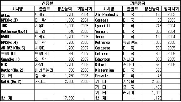 BP와 Celanese는 현재 싱가폴 및 말레이에서 초산(Acetic Acid) 플랜트를 가동하고 있는데, 유럽의 구식 Acetealdehyde 공법 플랜트를 가동중지하고 중국 또는 타이완에 신규로 Methanol 공법 플랜트를 건설하는 방안을 검토하고 있다. 이에 Mitsubishi Gas Chemical이 중국의 重慶에서 메탄올 85만톤 플랜트 건설을 추진하고 있다. MGC 플랜트가 가동되면 중국의 중소 플랜트는 여럿 가동을 중지할 것으로 예상된다. 그러나 아시아의 메탄올 수급타이트는 세계시장과는 반대로 완화되는 기미를 보이고 있다. 2004년 이란 NPC(National Petrochemical)의 No.3 100만톤 플랜트가 가동을 시작했고, 2005년에는 Mitsui상사 등 일본 화학기업들이 35%를 출자한 IMC의 100만톤 플랜트가 사우디에서 가동할 예정이기 때문이다. 사우디아라비아와 Mitsubishi Gas Chemical이 합작한 Ar-Razi도 2008년 N0.5 170만톤 플랜트를 가동할 계획이다. MGC는 브루나이에서도 메탄올 플랜트 건설을 추진하고 있다. 세계 메탄올 시장은 수요가 2003년 3120만톤에서 2008년 3400만톤으로 증가할 것으로 중동 및 남미의 신증설 플랜트가 본격 가동하는 2007년까지는 수급타이트가 계속될 것으로 전망된다. 표, 그래프: | Methanol 신증설 및 가동중지(2004-2008) | <화학저널 2005/01/24> |