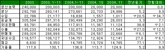 2004년 11월 무려 83.1% 증가 … 내수ㆍ수출 감소에 재고 증가 2004년 11월 SBR 생산량은 전월대비 9.9% 증가했으나 내수와 수출 모두 전월대비 감소해 재고량이 7.7% 늘었다.그러나 수출이 전월대비 12.5% 감소했음에도 불구하고 중국의 한국산 SBR 수입량은 전월대비 83.1% 증가했고 전체 수입량 가운데 한국산 비중도 58.2%로 10월 34.9%에 비해 23.3%p 확대된 것으로 나타났다. 2004년 1-11월 국내 SBR 생산량은 27만3661톤으로 전년동기대비 5.2% 증가했으며 수입은 1만6838톤으로 20.5% 감소했다. 수출은 한국타이어 및 금호타이어의 증설로 국내수요가 증가함에 따라 전년동기대비 27.0% 감소한 총 13만2873톤, 국내판매는 38.8% 증가한 11만7913톤을 기록했다.