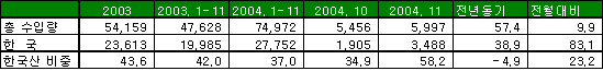 중국의 10월 전체 수입량 가운데 한국산 비중이 34.9%를 기록한데 비해 11월에는 한국산 수입비중이 58.2%에 달해 전체 SBR 수입량이 541톤 증가한 가운데 한국산이 1583톤 증가해 주목되고 있다. 중국의 SBR 수입량은 매년 증가하고 있으며, 2004년 SBR 수입량은 전년대비 57.4% 증가한 7만4972톤을 기록했고 한국산은 2만7752톤으로 전체의 37%를 차지하며 중국의 주 수입국으로 자리잡고 있다. <한유진 기자> 표, 그래프: | SBR 수급동향(2004.11) | 중국의 SBR 수입동향(2004.11) | <화학저널 2005/01/26> |
