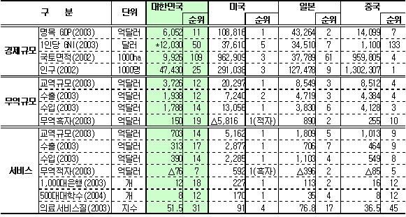 산자부, 570만톤으로 사우디ㆍ중국에 뒤져 … GDP는 세계10위 우리나라의 국내총생산(GDP) 규모가 멕시코를 앞질러 세계 10위에 오르고, 1인당 국민소득 2만달러 달성은 2008년 이루어질 것으로 예상됐다.산업자원부가 발표한 <세계속의 한국경제의 위상> 보고서에 따르면, 우리나라 GDP는 2003년 6052억달러로 세계 11위를 기록했으나 2004년에는 6674억달러로 멕시코(6631억달러 추정)를 제치고 10위를 차지한 것으로 추정됐다. 1인당 국민소득은 2003년 1만2030달러로 키프로스(1만2320달러), 포르투갈(1만2130달러)에 이어 세계 50위에 랭크됐으며, 2005년 1만2900달러에 달한 뒤 2008년에는 2만168달러로 2만달러 시대에 진입할 것으로 예상됐다. 수출은 2004년 2542억달러로 캐나다, 중국, 벨기에, 홍콩 등에 이어 세계에서 12번째로 2500억달러대에 진입했으며, 중계무역을 제외하면 네덜란드, 벨기에, 홍콩을 앞질러 자국생산상품의 세계 9대 수출국으로 평가됐다. 수입도 2003년 세계 14위에서 2004년에는 2245억달러로 멕시코(2048억달러 추정)를 제치고 1계단 오른 13위를 기록했다. 그러나 서비스와 금융 부문의 경쟁력은 일반 제조업에 비해 취약해 서비스 수출은 313억달러로 17위, 수입은 390억달러로 14위, 교역규모는 703억달러로 14위에 랭크됐다. 또 세계 1000대 은행(기본자본 기준) 중 우리나라 은행은 12개, 100대 은행에는 국민은행(79위)만이 포함됐는데 국내 1위인 국민은행도 세계 1위인 시티그룹에 비해서는 기본자본이 10분의1, 총자산은 8분의1에 그쳤다.