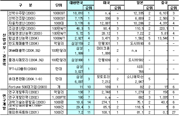 조선은 2003년 선박 수주량이 1881만톤(42.9%)으로 2위인 일본(28.1%)을 크게 앞질렀으며 선박 건조량도 718만톤(32%)으로 1위를 유지했다. 자동차 생산은 318만대로 전체의 5.2%를 차지하며 중국, 프랑스에 이어 6위에 올랐고 철강은 4630만톤을 생산해 미국, 러시아에 이어 5위를 차지했다. 석유화학 생산은 에틸렌(Ethylene) 기준 세계 생산량의 5.1%에 해당하는 570만톤으로 사우디, 중국에 이어 5위를 기록했으며, 합성섬유 생산능력은 293만톤(2004년 기준)으로 타이완, 미국에 이어 4위에 올랐다. IT제품은 반도체가 197억달러(8.7%)로 미국, 일본과 함께 3대 강국의 지위를 확보했고, 특히 D램(45.2%)과 플래시메모리(25.7%)는 세계 1-2위의 위상을 지켰으며 TFT-LCD도 41.7%로 타이완을 제치고 정상을 차지했다.