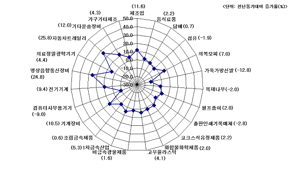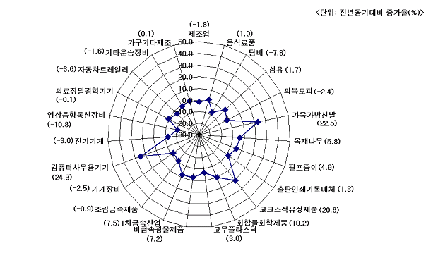 노동생산성이 하락한 5개 업종은 가죽ㆍ가방ㆍ신발(△12.8%), 컴퓨터ㆍ사무용기기(△9.0%), 출판ㆍ인쇄ㆍ기록매체(△2.8%), 목재ㆍ나무제품(△2.0%), 섬유(△1.9%) 등이다. 또 제조업 22개 업종 가운데 전년동기대비 단위노동비용이 감소한 업종은 9개로 상위 5개 업종은 영상ㆍ음향ㆍ통신장비(△10.8%), 담배(△7.8%), 자동차ㆍ트레일러(△3.6%), 전기기계ㆍ변환장치(△3.0%), 기계ㆍ장비(△2.5%) 등으로 나타났다.