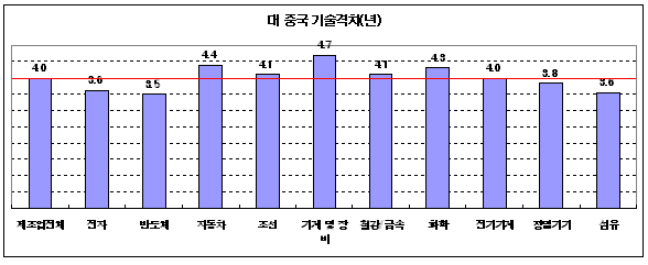 연구개발은 주로 1-2년 이내 활용 가능한 개발연구가 85%인 반면 기초연구는 2%에 그쳤고 연구개발 투자는 매출액의 4.8%로 2년 전 5.2%보다 낮아졌다. 연구개발 투자재원은 사내유보 조달이 68%로 가장 많고 연구개발 인력비중은 평균 9%로 나타났으며, 연구개발방식은 자체개발이 59%로 가장 많고 공동개발(22%), 기술도입(11%), 전략적 제휴(8%) 순으로 조사됐다. 신기술 개발제품의 시장진출 때 애로요인으로는 수요기업의 가격인하 요구가 42%로 가장 많았고 경쟁기업의 유사제품 출시(25%), 국내 수요기업의 국산품 기피(12%) 등도 지적됐다. 이밖에 연구개발 활동과 관련한 정부의 역할로는 연구개발 자금지원의 확충(53%), 산-학-연 연계지원, 연구인력 양성 지원(이상 12%), 연구개발 기반정비(10%) 등을 중시하고 있는 것으로 분석됐다. 표, 그래프: | 대 중국 기술격차(년) | 제조업 기술개발동향 조사결과 요약 | <화학저널 2005/02/11> |