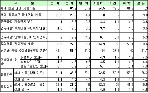 산자부, 세계 최고기술의 81.7% … 소재 31%에 설계기술 30% 불과 국내 제조업의 기술수준이 세계 최고 대비 평균 80% 수준인 것으로 평가됐다.산업자원부에 따르면, 최근 5849개 제조기업을 대상으로 <한국 제조업의 기술수준과 개발동향>을 조사한 결과 자기 회사의 기술수준에 대한 평가는 세계 최고 대비 80%로, 세계 최고수준이라고 응답한 곳 13%에 달했다. 업종별로는 IT산업이 84%로 가장 높았고 대기업(83%)이 중소기업(80%)보다 다소 높았다.