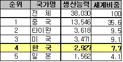 산자부, 2004년 생산능력 300만톤 밑돌아 … 중국이 1354만톤 1위 한국의 합성섬유 생산능력은 2004년 기준 293만톤으로 전체의 7.7%를 차지하며 타이완, 미국에 이어 4위를 기록했다.또 섬유류(직물+의류) 수출은 2002년 UN무역통계 기준으로 중국, 이태리, 독일, 미국에 이어 세계 5위에 랭크됐다.