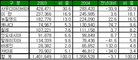 카타르산 수입량도 4만6812톤으로 34% 감소했으며 수입비중도 2003년 5.1%에서 3.4%로 낮아진 반면, 바레인 수입량은 6만5852톤으로 132%로 대폭 증가하면서 수입비중도 2003년 2%에서 4.8%로 2.8%p 높아졌다. 캐나다 수입량 역시 74.7% 증가하며 13만940톤으로 증가했고 수입비중도 9.6%로 4.3%p 확대됐다. 수입국 2위를 차지했던 이란은 순위를 유지함과 동시에 수입량이 3.6% 증가한 24만5985톤을 나타냈고 수입비중 또한 2003년 16.9%에서 18.1%로 1.2%p 높아졌으며, 3위인 뉴질랜드 역시 22.6% 증가한 22만4090톤이 수입됐고 수입비중도 3.5%p 높아진 16.5%를 나타냈다. <한유진 기자> 표, 그래프: | 중국의 Methanol 수입추이(2004) | <화학저널 2005/02/21> |