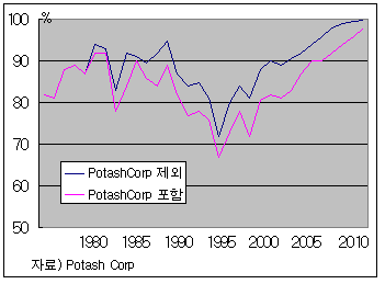 PotashCorp은 휴업일수 휴가 및 보수기간를 줄이고 2개 광산에 4교대를 도입함으로써 투자비용 없이 2003년보다 생산량을 250만톤 이상 확대할 수 있을 것으로 예상하고 있다. 캐나다 Vancouver에서 출하된 Potash 가격은 톤당 135달러를 형성하고 있다. 1980년 칼륨비료 최고가는 톤당 117달러에 불과했으나 2004년 266달러 수준으로 향상됐으며 2003년 대비 20% 상승했다. 만약 칼륨비료 가격이 추가로 20% 상승하면 PotashCorp의 Potash 총매출이익은 7억달러에 달할 것으로 전망된다. 인산비료 시장전망은 그리 밝지 않으며 PotashCorp의 인산 매출총이익은 1998년 2억달러 이상에 달했으나 2003년 적자를 기록했다. DAP(Diammonium Phosphate) 소비는 증가하고 있으나 생산능력이 더 빠른 속도로 증가하고 있어 수급상황은 앞으로도 여유로울 것으로 보인다. 표, 그래프: | 세계 Potash 가동률 | <화학저널 2005/02/22> |