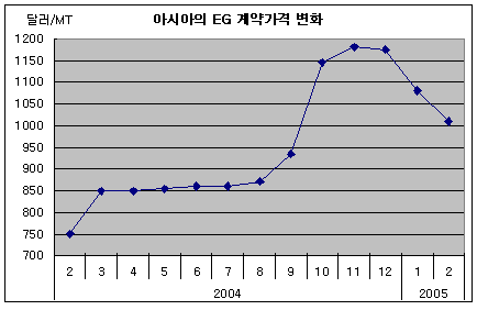 2월 ACP 톤당 70달러 하락 … 봄철 성수기 상승 가능성 대두 EG(Ethylene Glycol)의 2월 아시아 계약가격(ACP)이 전월대비 70달러 하락한 CFR 톤당 1010달러로 결정됐다.2004년 11-12월에는 1180달러로 최근 몇년 동안 유례없는 최고수준을 기록했으나 1월에는 100달러 하락했고 2월분도 2개월 연속 하락해 전환국면에 접어들고 있다. 이에 따라 3월분 계약가격도 더욱 하락할 가능성이 대두되고 있다. 다만, 타이트한 수급구조 자체에는 변화가 없어 시장에서는 봄 이후 본격적인 성수기에 접어들면 상승세로 돌아설 것이라는 견해가 지배적이다. EG 가격은 중국을 중심으로 Polyester 수요가 호조를 보여 2004년 계속 상승했으며 11-12월에는 1180달러로 과거 최고수준을 기록했다. 그러나 가격상승을 우려한 수요기업들이 2월의 구정연휴 이전에 구입을 기피하면서 1월분은 100달러 하락한 1080달러까지 떨어졌고, 2월분도 가격수정이 이어졌다.