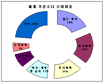 LG화학도 오스트레일리아의 Gladstone City에 24만톤 플랜트를 건설해 2005년 완공할 예정이었으나 조건이 맞지 않아 결렬시키고 중국 플랜트 건설로 선회했다. 미국의 가성소다 생산능력은 플랜트 폐쇄로 2003년 1.9% 감소했으나 북미 수요는 연평균 3% 증가해 수급이 타이트하게 유지될 것으로 예상되고 있다. 한편, CA는 Mercury-Cell 또는 Diaphragm-Cell 기술을 Membrane-Cell 기술로 전환하고 있으나 마진이 약화된 생산기업들이 투자를 줄이고 있어 성장속도가 더디게 나타나고 있다. 멤브레인-셀 기술은 전기 및 열 효율성이 우수하기 때문에 코스트가 낮게 나타나고 있다. 표, 그래프: | 세계 가성소다 소비비중 | <화학저널 2005/03/15> |