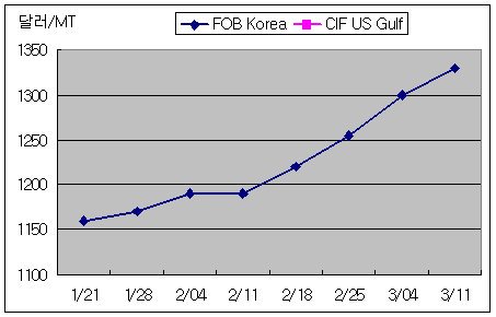 FOB Korea 1320-1340달러로 30달러 상승 … 정기보수로 공급부족 Butadiene 가격이 3월11일 FOB Korea 톤당 1320-1340달러로 30달러 상승했다.아시아 부타디엔 시장은 국제유가가 초강세를 유지하고 있는 상태에서 정기보수로 4월 공급이 부족할 것으로 예측됨에 따라 지속적으로 상승하고 있다. 다만, 부타디엔 가격상승이 지속돼 유도제품의 코스트가 상승하고 수익성이 악화되고 있어 1400달러 고지를 넘어설 수 있을 지는 의문이다. 아시아에서는 부타디엔 공급기업들이 CFR China 1400달러를 요구하고 있는 반면, 구매기업들은 1300달러 이상은 줄 수 없다고 버티고 있다. 중국에서도 SBR 내수가격이 톤당 1만4000元을 나타냄에 따라 최대 CFR 1300달러까지 구매할 수 있다는 입장을 보이고 있다.