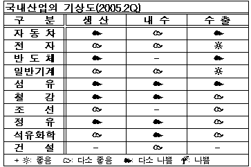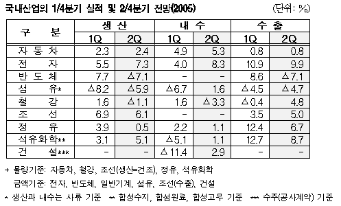 2/4분기에는 내수가 고가의류를 중심으로 살아나면서 다소 회복되지만 중국산 저가제품의 유입 증가, 고유가로 인한 원자재가격 인상 등으로 상승폭이 1.6%에 그치고, 수출은 원화강세, 개도국들의 지속적인 섬유 육성책 등으로 4.7% 감소하며, 생산도 5.9% 감소할 것으로 예상된다. 표, 그래프: | 국내산업의 기상도(2005.2Q) | 국내산업의 1/4분기 실적 및 2/4분기 전망(2005) | <화학저널 2005/03/18> |