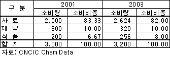 세계의료 분야에서 중국은 주로 니코틴산결핍증후군 및 혈관확장제로 사용되며 Isoniazid, Nikethamide 및 Linodil 등 의약 중간제품으로도 사용하고 있다. 또한 식품 분야에서는 주로 니코틴산결핍증후군 및 심장혈관 질환을 방지하기 위한 영양 증진제로 사용되고 있다. 중국은 곡물 및 곡물제품에 니코틴산 및 Nicotinamide 첨가량을 kg당 40-50mg으로 규정하고 있으며 최근 국민의 건강증진을 위해 일반 식품용 밀가루에 의무적으로 비타민을 첨가하도록 하고 있다. 첨가대상에 니코틴산 및 Nicotinamide도 포함돼 있다. 이에 따라 앞으로 중국의 니코틴산 및 Nicotinamide 수요는 지속적으로 증가할 것으로 전망되고 있다. 표, 그래프: | 중국의 니코틴산 및 Nicotinamide 소비현황 | 중국의 니코틴산 및 Nicotinamide 생산량 | 중국의 니코틴산 및 Nicotinamide 수출실적 | <화학저널 2005/03/22> |