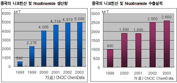 니코틴산ㆍNicotinamide 수요전망 밝아 … 사료산업 급성장도 거들어 중국은 1998년 Guangzhou Lonza Fine Chemical Industrial이 3400만톤 플랜트 3개를 완공한 이후 니코틴산 및 Nicotinamide 생산량이 급격히 증가해 메이저 생산국 가운데 하나로 떠올랐다.중국 통계청에 따르면, 중국에는 약 19개 생산기업이 있었으며 생산능력은 총 1만2200톤에 달했으나 2003년 6개 기업으로 줄어 생산능력 및 생산량은 각각 8100톤, 5000톤에 불가했으며 가동률 역시 61.73% 수준에 머물렀다. 최근 중국에서 유일하게 Guangdong Lonza Group가 Nicotinamide 9000톤 프로젝트를 추진하고 있으며 투자규모는 1억8240만元에 달하며 공사기간은 2004-05년이다.