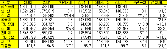 이에 대해 시장 관계자는 “전체적인 수요증가에는 큰 영향을 끼치지 못하겠지만 단기적으로 수입시장에는 호재로 작용할 것”이라고 강조했다. <심주영 기자> 표, 그래프: | 국내 LDPE 수급현황(2005.1) | <화학저널 2005/03/23> |