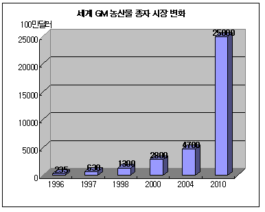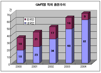 특허청에 따르면, GM 농작물 관련 국내외 특허 출원은 2000년부터 2004년까지 총 265건으로 매년 꾸준히 증가하고 있다. 기술세대로 구분하면, 작물 생산성을 향상시키는 제1세대 GM 농작물이 53%로 가장 큰 비중을 차지하고 잇고 제2세대, 제3세대 순이지만 최근 건강과 영양에 대한 일반인들의 관심이 고조되면서 제3세대 GM 농작물 관련특허가 급격히 증가하고 있다. 출원인은 내국인이 69%(184건), 외국인이 31%(81건)이고 외국인 출원은 일본 14%, 미국 9%, 스위스 2% 순으로 나타나고 있다. 국내 GM 농작물 연구를 주도하고 있는 서울대학교 농생명공학부 최양도 교수(작물유전체기능연구사업단장)에 따르면, 21세기는 맞춤 농작물의 시대가 되고, 현재는 재배 GM 농작물의 대부분을 제1세대 GM 농작물이 차지하고 있지만 소비자의 요구에 부응해 영양과 건강에 관련된 고부가가치의 제2세대, 제3세대 GM 농작물에 관한 연구와 특허 출원이 활발하게 진행될 것으로 예상되고 있다. 표, 그래프: | 세계 GM 농산물 종자 시장 변화 | GM작물 특허 출원추이 | <화학저널 2005/04/26> |