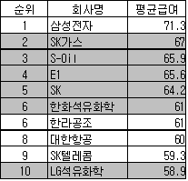 SK가스ㆍS-OilㆍE1ㆍSKㆍ한화 2-6위 … 상위 10사 평균연봉 6340만원 화학기업들이 매출액 100대 상장기업의 연봉 순위에서 상위권을 싹쓸이했다.<월간CEO> 5월호에 따르면, 매출액 기준 100대 상장기업의 임직원 평균연봉을 조사한 결과, 직원 1인당 평균 급여는 삼성전자가 7130만원으로 1위를 기록했고 2위는 SK가스 6700만원, 3위는 S-Oil 6590만원이 차지했으며 E1 6560만원, SK 6420만원이 뒤를 이었다. 또 한화석유화학이 6100만원으로 6위에 올랐고, LG석유화학은 5890만원으로 10위에 랭크됐다.