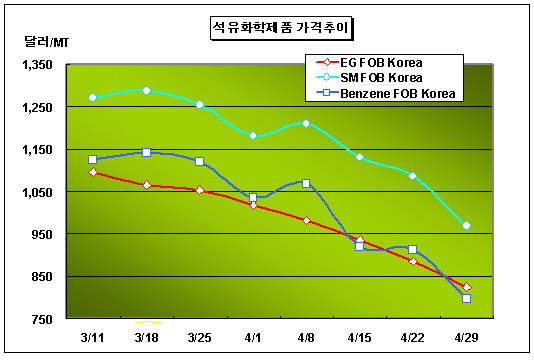 아울러 중국이 5월 1-7일 노동절 연휴를 맞아 PS 및 ABS 가공공장 가동을 중단하면서 SM 시장에도 영향을 미치고 있으며, 5월 초에는 PS 및 ABS 가격에도 영향을 미쳐 Styrene 체인 전체의 가격붕괴 현상이 우려되고 있다. 폴리올레핀 가격도 하락세를 보이기 시작해 HDPE 가격은 4월27일 CFR FE Asia 톤당 1010-1030달러로 20달러 하락했고, PP 가격은 CFR FE Asia 톤당 1070-1100달러로 40달러 급락했다. PVC 역시 CFR FE Asia 톤당 800-810달러로 25달러 하락했다. 아시아 폴리머 시장은 중국의 플래스틱 가공기업들이 5월 1-7일 노동절 연휴 동안 공장가동을 중단하기 위해 구매에 나서지 않음에 따라 크게 하락했고, 5월 초에는 연쇄적인 폭락현상이 예상되고 있다. 표, 그래프: | 석유화학제품 가격추이 | <화학저널 2005/05/02> |