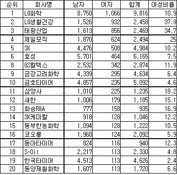 여성 채용비율이 4% 미만인 화학기업은 대림산업(유화사업부), 대한유화, 한솔케미칼, 휴켐스 등 석유화학기업들이 대거 포진해 있으며, 호남석유화학은 2.6%, 한국타이어와 카프로는 각각 2.4%로 나타났다. 남해화학은 여성인력이 2명에 불과해 0.4%로 가장 낮은 수준을 기록했다. <주인경 기자> 표, 그래프: | 상장 화학기업의 성별 종사자수 현황(2004) | <화학저널 2005/05/03> |