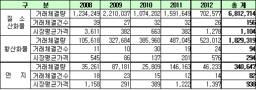 환경부는 대한상공회의소와 연계해 5월경에 추가 모의거래를 실시하는 등 사업장에 대해 지속적으로 교육ㆍ홍보 예정이다. 표, 그래프: | 대기오염물질의 거래가격 | 대기오염물질 모의거래 내역 | <화학저널 2005/05/04> |