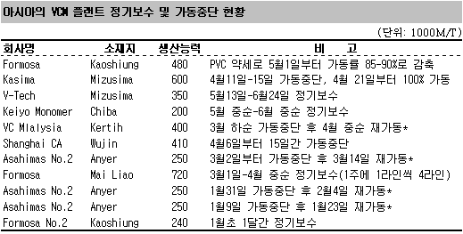 표, 그래프: | 아시아의 VCM 플랜트 정기보수 및 가동중단 현황 | <화학저널 2005/05/18> |