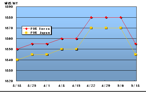 FOB Korea 1350-1360달러로 15달러 하락 … 7월 미국산 7000톤 유입 Butadiene 가격이 5월13일 FOB Korea 톤당 1350-1360달러로 15달러 하락했다.아시아 부타디엔 가격은 중국의 구매가 감소함에 따라 장기간의 상승세를 마감하고 약세로 전환했다. 아시아 부타디엔 시장은 플랜트 가동중단이 다발적으로 발생함에 따라 연초부터 계속 상승세를 보여 2005년 3월 톤당 1300달러를 넘는 고공행진을 계속해왔다. 그러나 중국의 노동절 연휴가 끝났음에도 구매가 살아나지 않고, 더욱이 7월 미국에서 7000톤이 유입될 예정이어서 당분간 약세가 지속될 전망이다. 타이완과 중국의 CFR 가격은 1370-1380달러를 형성하고 있다.