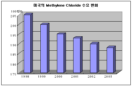 MC 수입량은 2002년 1760만파운드, 2003년 1720만파운드를 기록했고 수출은 2002년 1억1700만파운드, 2003년 1억6300만파운드로 수입량의 10배 수준에 달했다. 미국의 MC 수요비중은 페인트 제거 및 Stripping 30%, 접착제 22%, 의약품 11%, 금속세척 8%, 에어로졸 8%, 화학제품 처리 8%, 연질 PU Foam 5%, 기타 8%로 나타나고 있다. 미국 MC 시장은 1998-2003년 연평균 1.7% 마이너스 성장률을 기록했으며 2007년까지도 1%대의 마이너스 성장세를 유지할 것으로 전망된다. 표, 그래프: | 미국의 Methylene Chloride 수요 변화 | <화학저널 2005/05/26> |