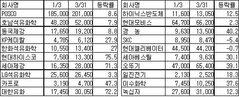 영업이익 증가 상위 20사는 1/4분기 말 현재 주가상승률이 2004년 말 대비 평균 1 7.6%를 기록해 종합주가지수 상승률 8.1%를 9.5%p 초과해 영업이익 증가로 주가에서도 혜택을 본 것으로 나타났다. KP케미칼은 주가가 27.9% 상승했으며 한화석유화학은 27.0%, 현대하이스코는 75.5%, 세아제강은 71.3%, 대한유화는 72.2%, 경농은 40.2%, 오뚜기는 39.1% 올랐다. 표, 그래프: | 영업이익 증가 상위기업의 주가 등락현황(2005) | <화학저널 2005/05/27> |