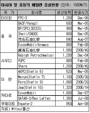 에틸렌 신증설은 2005년부터 2008년까지 세계적으로 연평균 500만톤 이상으로 집계되고 있으며, 에틸렌 수요증가량은 세계경제 상황에 따라 진폭의 차이가 있으나 연평균 135만톤에서 420만톤으로 세계 GDP성장률에 연동하는 것으로 분석되고 있다. 2003년과 2004년에는 에틸렌 수요가 폭증했으나 생산능력은 250만톤 이하 증가하면서 영업이익이 폭등하는 등 시장구조가 왜곡되는 현상이 나타났다. 그러나 4년간 에틸렌 생산능력이 2000만톤을 넘어 2004년 기준 세계 에틸렌 생산능력의 17.5%에 달함으로써 공급과잉 우려가 강해지고 있다. 대표적인 에틸렌 유도제품인 PE(Polyethylene), EG(Ethylene Glycol)는 에틸렌과 병산되는 특성이 있어 급증하는 에틸렌 증설로 동반 공급과잉이 예상된다. 신규 증설설비는 에틸렌만의 단독공정을 생각할 수 있으나 에틸렌은 기체이기 때문에 톤당 운임이 높아 에틸렌을 고체나 액체인 유도제품으로 가공해야 이동과 수익성을 확보할 수 있기 때문이다. PE는 과거 3년간 세계적으로 생산능력이 520만톤 증설됐으나 2005년부터 3년간 아시아 및 중동에서만 690만톤의 증설물량이 쏟아져 수급구조에 심대한 영향을 발생시켜 수익성 하락을 가져올 것으로 예상되고 있다. EG는 더욱 심각해 과거 3년간 세계적으로 100만톤의 생산능력이 증가했고 2005년부터 3년간 아시아 및 중동 기준으로 446만톤이 몰려 극심한 공급과잉 현상을 보일 것으로 예상된다. 표, 그래프: | 아시아 및 중동의 에틸렌 증설현황 | <화학저널 2005/05/30> |