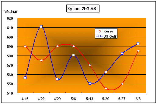 FOB Korea 580-590달러 형성 … 중국 남부지역 수요증가도 영향 Xylene 가격은 6월3일 FOB Korea 톤당 580-590달러로 35달러 상승했다.아시아 자일렌 시장은 중국의 남부지역에서 여름철의 계절적 수요증가 현상이 나타나고 한국의 공급마저 차질을 빚으면서 상승세로 전환됐다. 그러나 중국 남부지역으로 수출된 2000톤 Parcel은 FOB Korea 톤당 570달러에 불과했고, 필리핀의 Petron도 6월 하순 판매물량 5000톤을 FOB 570달러에 내놓아 추가 상승에 장애요인으로 등장하고 있다.