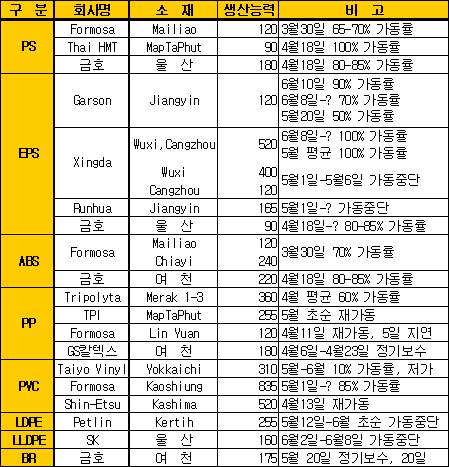 아시아 가격 약세 장기화에 정기보수로 대응 … 중국 플랜트 가동으로 PS와 EPS, LDPE 등 합성수지 가격약세가 지속되고 있는 가운데 아시아 합성수지 플랜트 가동률도 저조한 것으로 나타났다.PS는 Thai HMT가 4월 18일 가동률 100%, EPS는 Xingda가 5월과 6월 가동률 100%를 나타냈으나 최근 수요가 급격히 떨어지고 있는 상황을 반영해 대부분의 합성수지 플랜트 가동률이 저조한 것으로 드러났다. 합성수지 가격급락 현상은 최근 700달러 수준까지 떨어진 에틸렌 가격과 중국 BP(상하이)와 BASF(南京)의 대형 플랜트 가동으로 인한 구매 위축, 미국과 유럽의 수요 부진 등이 주요한 원인으로 지적되고 있다. 또 2005년 초 플랜트의 잇단 정기보수 및 가동중단까지 겹쳐 합성수지 약세가 중반기까지 계속 이어지고 있는 것으로 분석된다.