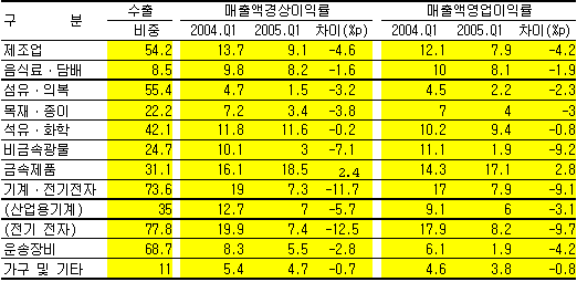 제조업 가운데 수출을 주도해온 간판업종인 기계ㆍ전기전자 업종은 환율하락과 함께 반도체, LCD 등의 가격경쟁 격화에 따른 판매가격 하락으로 경상이익률이 19.0%에서 7.3%로 11.7%p 급락했다.
