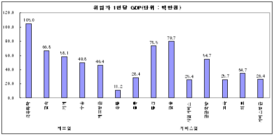 산자부, 1억500만원으로 제조업 2배 넘어 … 생산비중도 최대치 한국은 제조ㆍ수출 중심의 발전모델에 해당하며 일부에서 일고 있는 서비스 중심 산업구조 개편 주장에도 불구하고 한국경제는 제조업과 수출을 근간으로 해야 한다는 분석이 제기됐다.산업자원부가 6월20일 발표한 <선진형 산업구조 분석 및 정책 대 방향> 보고서에 따르면, 한국은 제조업ㆍ수출 중심의 발전모델에 해당하고 선진국 중 독일과 발전모델이 가장 유사한 것으로 나타났다. 한국은 1995년부터 2004년까지 소득 1만달러대 기간에 국내총생산(GDP)에서 제조업 비중이 27-28%대로 안정적인 수준을 유지해왔다. 최근에는 제조업 비중이 1만달러 진입기보다 더 증가하고 제조업의 성장 기여도가 70%를 차지하는 등 전형적인 제조업 발전모델을 보이고 있다.