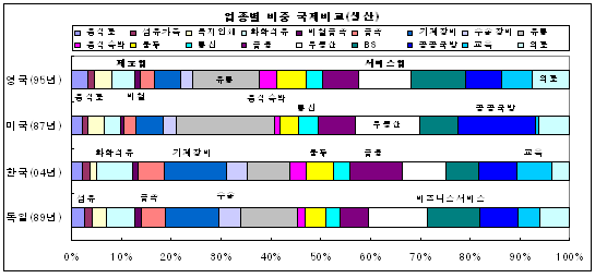 한국 경제는 1995년 소득 1만달러를 돌파한 이래 10년간 1만달러대를 벗어나지 못하고 있으며, 선진경제인 혁신주도형 경제로의 구조 개편도 미흡한 실정이다. 특히, 선진산업 구조를 이루기 위해서는 서비스 산업을 집중 육성하고 사회서비스 분야에서 일자리 창출을 늘여야 한다는 주장이 최근 부각되고 있다. 때문에 소득 1만-2만달러 기간에 탄탄한 제조업을 발전기반으로 수출을 통해 성장한 한국의 발전전략이 여전히 유효한가에 대한 평가가 필요한 시점이다. 산자부는 한국에 맞는 선진형 발전모델을 발굴하고 벤키마킹을 위해 미국, 일본, 영국, 독일 등 선진국의 산업, 무역 구조의 변화와 발전 전략을 분석했다. 표, 그래프: | 취업자 1인당 GDP | 업종별 비중 국제비교(생산) | <화학저널 2005/06/22> |
