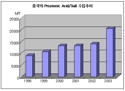 중국은 벤조산(Benzoic Acid) 및 염, 소르브산(Sorbic Salt) 및 염, Sodium Diacetate, Propionic Acid 및 염 등을 식품 부패방지제로 사용하고 있으나 벤조산은 독성이 강해 해마다 수요가 감소하고 있으며 소르브산 및 염, Propionic Acid 및 염, Sodium Diacetate를 사용하고 있다. 또 Propionic Acid 및 염 혼합물은 소르브산-염 혼합물에 비해 가격이 낮고 Sodium Diacetate에 비해 물성이 좋기 때문에 수요 전망이 가장 밝은 것으로 평가된다. 따라서 중국은 Propionic Acid 전용 생산 플랜트는 보유하지 않고 있으나 소비가 꾸준히 증가하고 있어 수요의 대부분을 수입에 의존하고 있다. 그러나 최근 Yangzi-BASF가 합작으로 추진하고 석유화학 프로젝트에 Propionic Acid 3만톤 플랜트가 포함돼 있어 플랜트가 완공되면 전량 내수시장에 공급될 예정이다. 또 Yangzi-BASF의 Propionic Acid 3만톤 플랜트는 Propionic Acid 유도제품에 이용될 저가의 고품질 원료를 공급함으로써 중국 내수시장의 수급타이트가 다소 완화될 것으로 보이나 또 다른 문제를 야기할 것으로 전망된다. 중국은 오랫동안 Propionic Acid를 생산하지 않았기 때문에 수입에 의존해 왔던 식품/사료 첨가제 분야 외 다른 수요분야의 개발이 미흡한 상태이다. 따라서 앞으로 중국은 대규모 생산에 대비해 다운스트림 제품 개발에 주력해야할 것으로 지적된다. Propionic Acid의 주요 다운스트림에는 Propionic Salt, Propionic Ester, 식품ㆍ사료첨가제에 사용되는 정밀화학제품, 의약품, 농약 및 향신료 등이 있다. 또한 Propionic Acid는 식품ㆍ사료 부패방지제로 사용되는 Calcium Propionate 및 Sodium Propionate 외에도 고무 보조제 및 박테리아 억제제, Nitrocellulose, 코팅 및 광택제용 솔벤트에 사용되는 Ethyl Propionate, 다양한 천연 또는 합성수지, 화장품 항료, 말라리아 치료제에 사용되는 Pyrimehamine 합성, 다양한 코팅제품에 사용되는 특수 솔벤트용 Propyl Propionate, Nitrocellulose 및 천연 또는 합성수지 솔벤트로 사용되는 Butyl Propionate, 광택제 및 Amyl Accetate용 건조 방지제, 식품용 향료, 식품 향료 및 코팅용 유기 솔벤트에 사용되는 Isopentyl Propionate 등에도 사용되고 되고 있다. 표, 그래프: | 중국의 Propionic Acid/Salt 수입추이 | <화학저널 2005/06/29> |