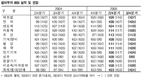화학산업은 3/4분기 설비투자 BSI가 109로 전망됐는데, 2/4분기 111에 비해서는 2p 떨어지나 1/4분기 108에 비해서는 1p 높게 나타나고 있다. 표, 그래프: | 설비투자 BSI 실적 및 전망 | <화학저널 2005/07/07> |