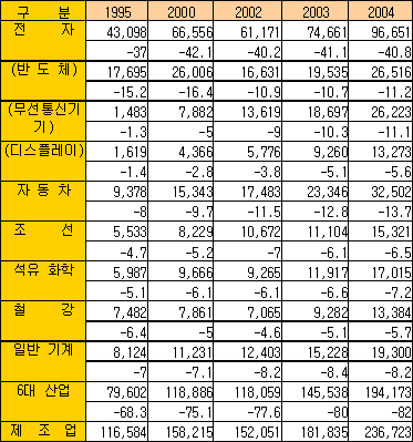 특히, 전자(447억달러)를 비롯해 자동차(283억달러), 조선(143억달러) 등 3대 산업이 무역흑자의 효자노릇을 톡톡히 하고 있는 것으로 분석됐다. 6대 산업의 생산이 제조업 생산에서 차지하는 비중은 1995년 45.8%에서 2003년 52.8%로 높아졌으며, 전자가 15.2%에서 19.4%로, 자동차는 9.6%에서 11.1%, 조선은 2.5%에서 3.3%로 상승했다. 생산 대비 수출비중은 조선업이 99.8%로 가장 높았고 다음으로 전자(93.0%), 자동차(68.6%), 석유화학(49.2%), 일반기계(39.4%), 철강(27.6%) 순이었다. 6대 산업의 세계시장 점유율은 1995년 3.4%에서 2003년 4.1%로 높아졌으나 일본(10.3%)과 중국(5.8%)에 비해서는 낮았다. 산업별로는 조선이 2003년 기준 세계시장 점유율 21.0%로 다른 업종에 비해 가장 높았고 석유화학은 5.8%, 전자 5.6%, 자동차 3.4% 등이었다. 전자산업 가운데서는 무선통신기기 12.0%, 반도체 5.8%를 나타냈다. 한국은행은 2000년 이후 무선통신기기와 디스플레이 등 일부 전자산업과 조선업 등에서는 기술비교우위업종이 늘어나는 등 기술경쟁력이 높아지는 모습이지만 자동차와 석유화학, 철강 등 대부분은 기술경쟁력보다는 생산비 비교우위를 나타내 여전히 가격경쟁력에 의존하는 것으로 나타났다고 강조했다. 표, 그래프: | 6대 수출 주력산업의 수출동향 | <화학저널 2005/07/18> |