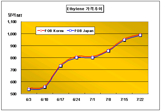 FOB Korea 990-1000달러 형성 … 생산기업 가격지지 방침 확고 Ethylene 가격은 7월22일 FOB Korea 톤당 990-1000달러로 40달러 상승했다.아시아 에틸렌 시장은 PE를 비롯한 유도제품 시장의 약세와 중국의 PVC 수요 둔화로 인한 EDC 및 VCM 플랜트의 가동률 감축으로 CFR FE 및 SE 가격이 보합세를 나타냈다. 그러나 일본과 타이완기업들이 CFR 및 FOB 제시가격을 톤당 1000달러 이상을 고수함에 따라 FOB 가격이 오름세를 나타냈다. 특히, 싱가폴 PCS(Petrochemical Corp. of Singapore)의 Pulau Merbau 소재 No.1 나프타(Naphtha) 크래커가 8월 말부터 3주간의 정기보수에 돌입한다는 소식이 전해진 후 생산기업들이 제시가격 수준을 더욱 확고히 고수한 것으로 알려지고 있다.