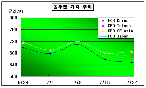 NE Asia 폭락하고 SE Asia는 오름세 … PCS No.2 플랜트 가동중단 아시아의 7월 톨루엔(Toluene) 가격이 지역마다 가격 동향이 서로 다른 것으로 나타났다.7월 초순부터 7월22일까지 North East Asia 가격은 톤당 11-32.50달러 폭락했으나 South East Asia 가격은 톤당 5달러 올랐다. FOB 가격은 SM(Styrene Momomer)과 벤젠 가격 상승세로 35달러 급등해 9월 계약가격이 톤당 650달러에서 형성됐는데 9월 상순 인도분 가격은 670달러를 기록했다. 또 7월22일까지 내수가격과 수출가격 차이는 톤당 50달러까지 벌어졌다. South East Asia 가격은 톤당 5달러 올랐는데 싱가폴 PCS(Petrochemical Corporation of Singapore)의 BTX No.2 플랜트가 7-10일간 가동 중단으로 공급이 타이트해지고 수요도 늘고 있기 때문이다. PCS는 No.2 플랜트 가동중단으로 톨루엔 공급계약 물량의 20%를 삭감한 것으로 알려졌으며 BTX No.1 플랜트도 8월 하순에 3주간 정기보수에 돌입할 예정이어서 수급이 계속 타이트할 전망이다.