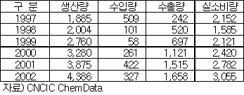 중국은 Mannitol 순수출국이라고 해도 과언이 아닌데, 2003년 수출량은 1382톤으로 전년대비 감소했으며 수입량이 532톤으로 오히려 증가했다. 중국은 주로 제약 및 식품 분야에서 Mannitol을 사용하고 있는데, 2002년 소비량은 3055톤에 달했으며 수요비중은 제약이 60%, 식품 및 식품 첨가제가 30%, 기타 10%로 나타났다. 제약 분야에서 Mannitol은 주로 Mannitol Injection 및 기타 의약품 및 첨가제 합성에 이용되고 있다. 최근 중국은 비만 및 당뇨병 등이 사회적 이슈로 등장하면서 Mannitol 수요가 더욱 늘어날 것으로 전망되는데, 특히 무설탕 감미료 Mannitol 수요비중이 확대될 것으로 보인다. 또 Mannitol은 시장 전망이 밝은 여러 다운스트림 제품의 원료로 사용되는데, 종양, 심장혈관질환 의약품, 세균감염방지 의약품, 일상용 화학제품 Emulsifier 및 농약, Mannitol 경질 PU Foam, Modified Mannitol, Alkyd Resin, Electroplating Fluid용 산화방지제 및 안정제, 식물성장 조절제 및 저장 처리제 분야에서 시용되고 있다. 따라서 중국의 Mannitol 수요는 2005년 약 4500톤에 달할 것으로 전망된다. 그러나 소비증가율이 생산증가율에 못 미치기 때문에 소규모 생산기업들이 시장경쟁에서 대거 탈락할 것으로 보인다. 표, 그래프: | 중국의 Mannitol 수급상황 | <화학저널 2005/08/09> |