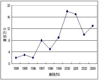 유용물질이 첨가된 녹차는 사용재료에 특징이 있는 출원 55건 중 47건을 차지했으며, 첨가물질은 식물체를 첨가물질로 사용한 것이 43건(85%)으로 가장 많았다. 식물체로는 한약재를 사용한 것이 주를 이루었으며, 단일재료 첨가는 인삼, 어성초, 매화, 압맥 등이 많았다. 식물체 외의 첨가물질 사용 출원은 4건(15%)으로 숯, 미네랄, 세라믹, 알칼리염 등이 있다. 녹차 관련특허 출원인은 1998년까지 주로 관련기업과 국가연구기관이 주를 이루었으나, 1999년 이후에는 개인, 지방자치단체, 영농조합법인에 의한 출원이 53%를 차지해 출원인의 폭도 다양해지고 있다. 특히, 개인 출원(50%)이 크게 늘어났다. 특허청은 최근 생활이 여유로워지고 국민소득이 높아짐에 따라 건강에 대한 관심과 욕구가 크게 급증하면서 몸에 좋은 물질을 첨가해 건강식품으로서의 기능성을 향상시킨 녹차 관련특허 출원이 점차 늘어날 것으로 보고 있다. 이에 따라 녹차를 생산하는 식품기업 뿐만 아니라 대학 등 연구기관에서 녹차관련 고품질 기술개발에 힘써야 할 필요가 있고, 정부 차원의 체계적이고 효율적인 관리도 절실히 요구되고 있다. 표, 그래프: | 녹차 관련기술 특허 출원추이 | <화학저널 2005/08/26> |
