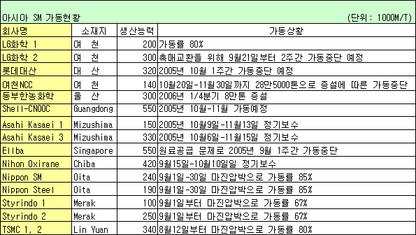표, 그래프: | 아시아 SM 가동현황 | <화학저널 2005/09/20> |