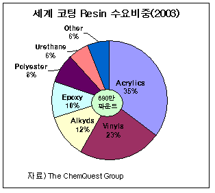 또 최근 이상적인 저금리 영향으로 인해 가정용 제품 판매가 급증하고 있어 당분간 건축페인트 강세가 지속될 것으로 전망되며 주택시장의 활성화가 건축 페인트 수요의 최대 변수로 작용할 것으로 예상된다. DuPont Coatings & Color Technologies에 따르면, 2004년 봄에서 가을에 이르는 건축페인트 시즌은 2003년에 비해 초강세를 나타냈는데, 2003년은 춥고 습한 날씨로 인해 수요에 큰 타격을 받았다. DuPont Coatings은 건축시장에 TiO2를 공급하고 있다. 플로리다주 및 걸프 해안지역 등 몇몇 지역은 허리케인의 영향으로 페인트 수요가 일시적으로 증가했으나 주택 재건축이 시작되면 페인트 수요가 다시 강세를 회복할 것으로 전망된다. 또 허리케인의 영향으로 많은 자동차와 자동차정비센터가 큰 타격을 받아 자동차 도수도료(Refinish) 시장도 수요가 늘어날 것으로 전망된다. 표, 그래프: | 세계 코팅 Resin 수요비중(2003) | <화학저널 2005/09/21> |
