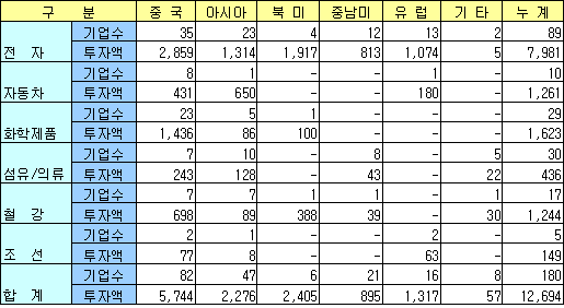 전자는 해외투자액이 89사에 79억8100만달러에 달했고, 화학제품은 29사에 16억2300만달러를 기록했다.